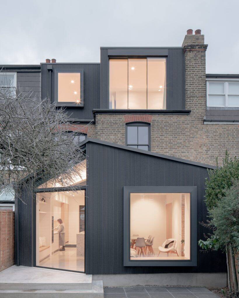 The remarkable transformation of this London townhouse is truly amazing. The renovation, which involved expanding the kitchen and introducing slatted cladding to the lower portion of the building, is a brilliant solution especially for those with tall structures.