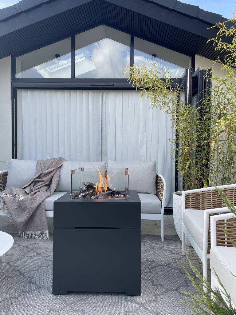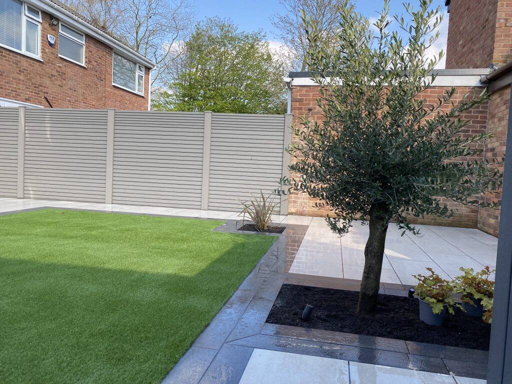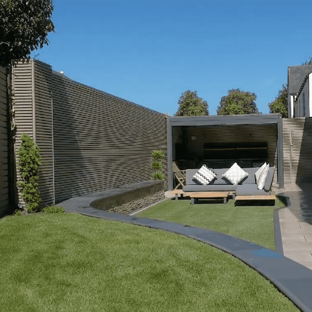This full garden renovation uses our Clarity Graphite composite fence panels to create a luxury border of the new space but is also complemented by Forma Slatted cladding in Silver birch to screen off the back and sides of the sheltered outdoor kitchen.