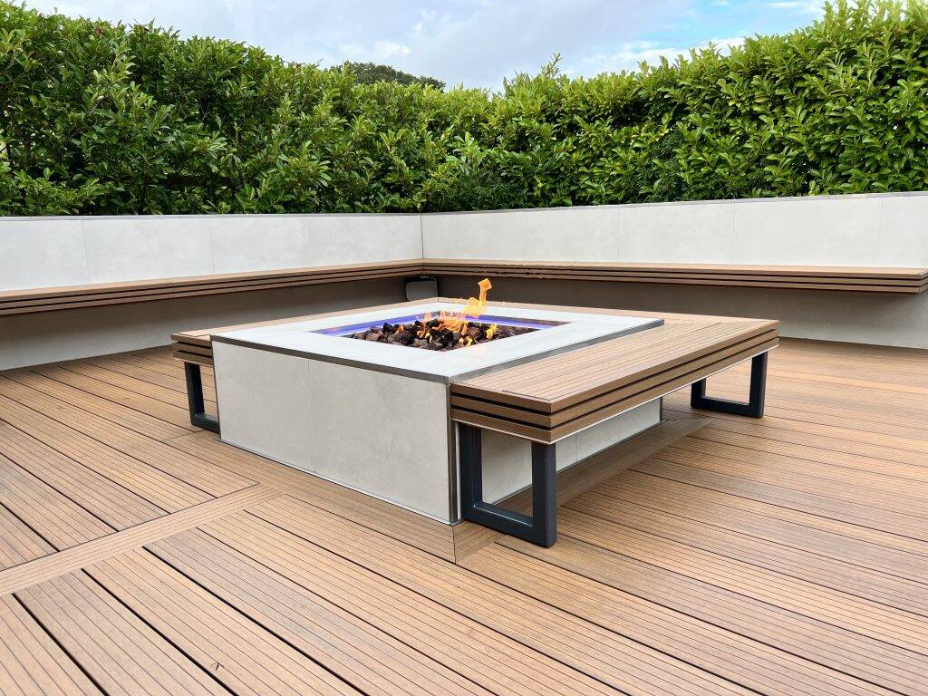 This fabulous multifaceted project uses Forma Composite Decking in Spiced Oak for a fantastically durable and slip resistant pool surround ensuring practicality and safety. Our Forma decking is also used in the alfresco dining, outdoor kitchen and sunken relaxed seating areas. The project ties in Forma Slatted cladding for the finishing of the step detail and benches surrounding the luxury firepit and screening as an extra attention to detail and precision