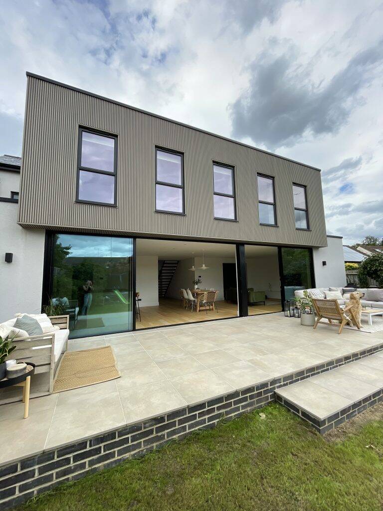 Our spiced oak slatted cladding, juxtaposed with the pristine white render and lush greenery has truly elevated this renovation. The distinctive design of the front door extension adds a unique modern take on a classic house.