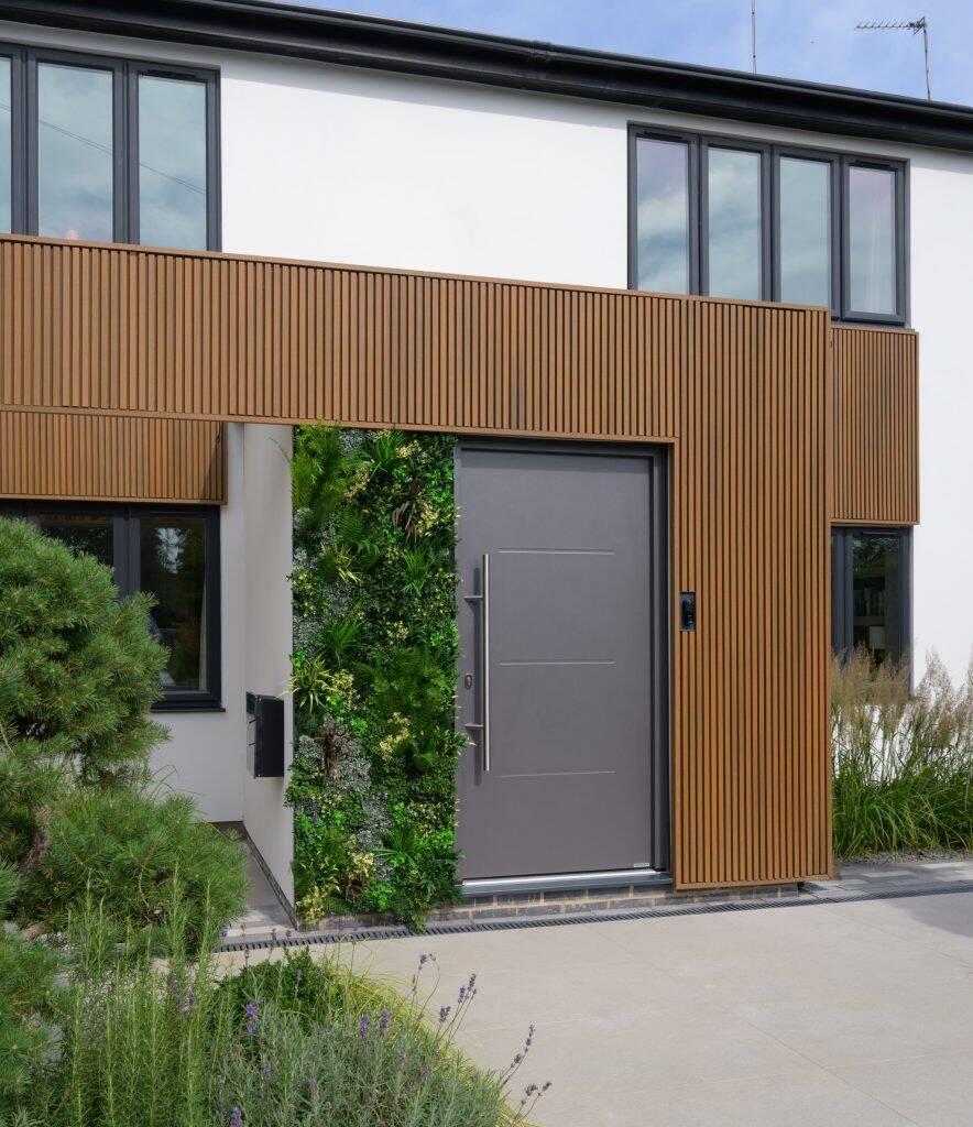 A tasteful touch of slatted cladding graces the front door, whilst the rear of the property boasts a prominent main feature. The execution of the finish in this design is truly impeccable, showcasing a remarkably high standard.