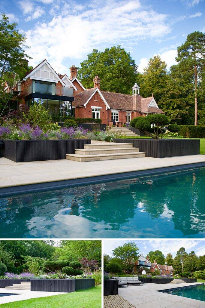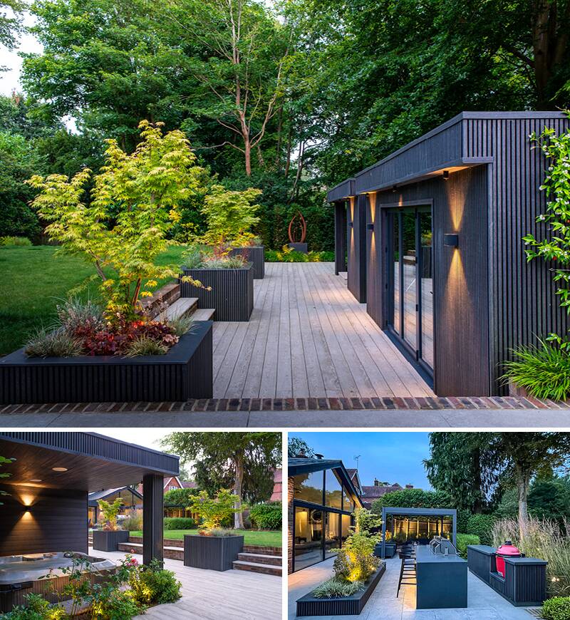 Our ever-popular Midnight Slatted Cladding has been beautifully used at this stunning property to clad the planters with striking effect. The black wood-effect finish adds a dramatic yet sophisticated touch, contrasting elegantly with the planting and architecture. The result is a serene, stylish space that perfectly blends modern and traditional materials. The beautiful design is emphasised by the perfectly balanced lighting, image composition and colours.