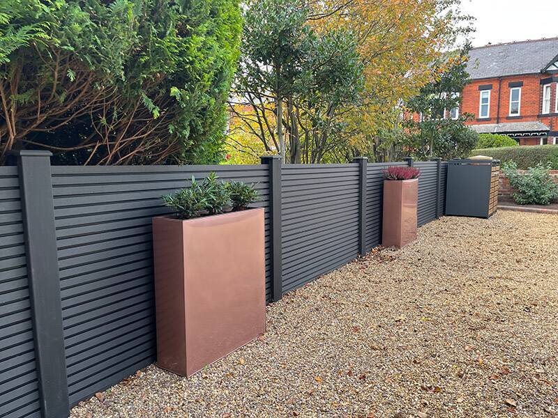 Product – Clarity Composite Fencing – Graphite // Forma Slatted Cladding – Silver Birch