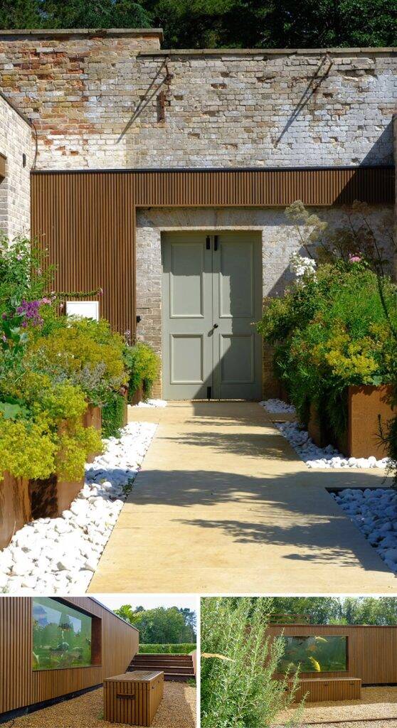 Chris and Melanie’s submission beautifully blends innovation with refined style. We love how the modern Spiced Oak Slatted Cladding contrasts with the rustic brick wall and traditional door — a perfect example of how old and new can complement each other. By leaving the weathered brick exposed around the doorway, the design allows both materials to shine. The planting is exquisite, and the corten steel planters subtly echo the rich tones of the cladding, creating a warm, cohesive look.
